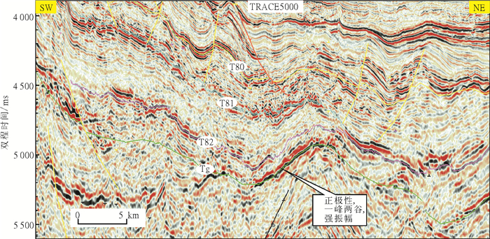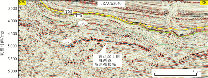 4) Tg:古近系的底面, 中生界与新生界之间的区域不整合;削蚀下伏较厚地层, 上覆地层上超, 说明下伏中生界地层褶皱, 晚白垩末期发生构造运动。Tg界面一般为一峰两谷中强正反射, 频率较低, 连续性中—差(见图 4)。