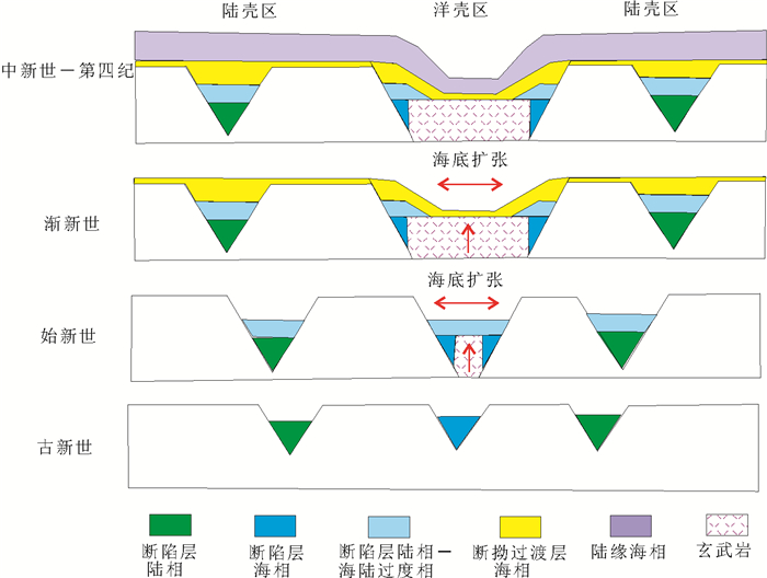 图 2 洋壳边缘断陷层海相沉积演化示意图 Fig. 2 Sketch map of sedimentary evolution during rift period along oceanic crust |