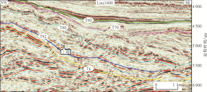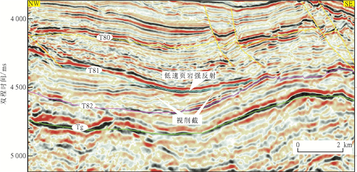 图 4 T82上超反射界面及Tg削减不整合反射界面 Fig. 4 T82 onlap refection and Tg truncation reflection |
