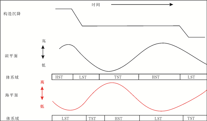 图 5 断陷盆地海、湖平面变化及体系域划分与断裂拉张引起的构造沉降之间的关系(据Strecker U, 1999修改) Fig. 5 Water level change and system division, relationship between fault extension and structure subsidence |