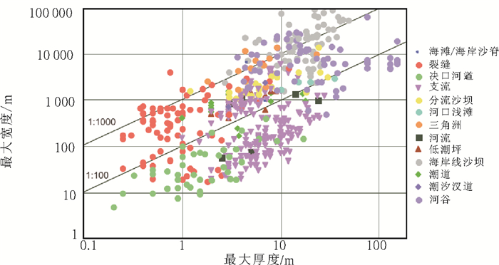 图 6 不同微相砂体最大厚度与最大宽度双对数图(据Reynolds, 1999) Fig. 6 The max thickness and max wideness of different microfacies sand body |