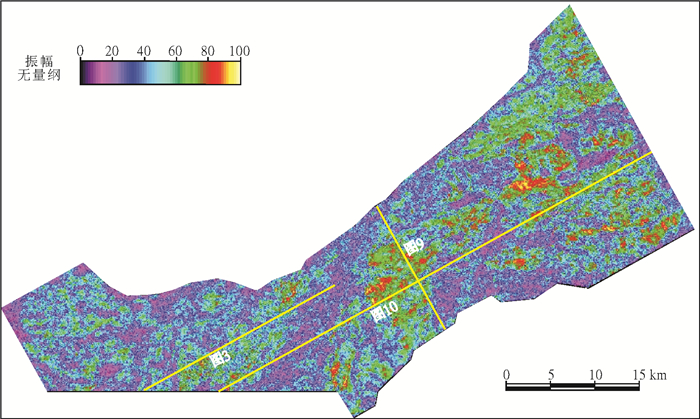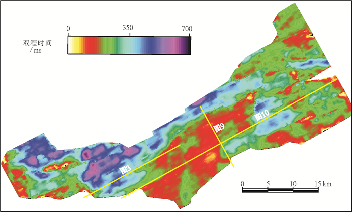 2) T81:文昌组中段与上段的界面, 为一个视削截面, 反映来自正西向的物源;海平面快速上升, 为最大海泛面;中强振幅, 中低频率(见图 3)。由于海平面上升形成了深水低速页岩沉积, 所以地震剖面上表现为一谷两峰强振幅特征。