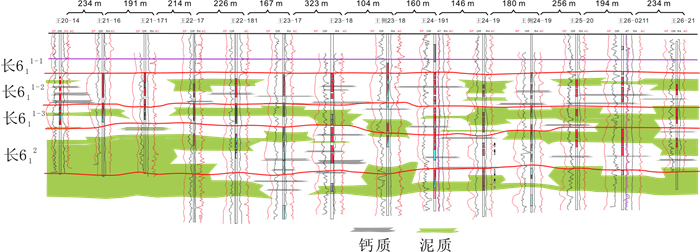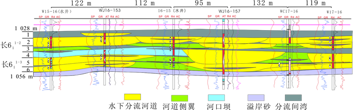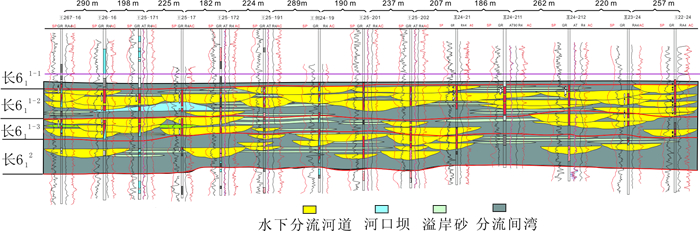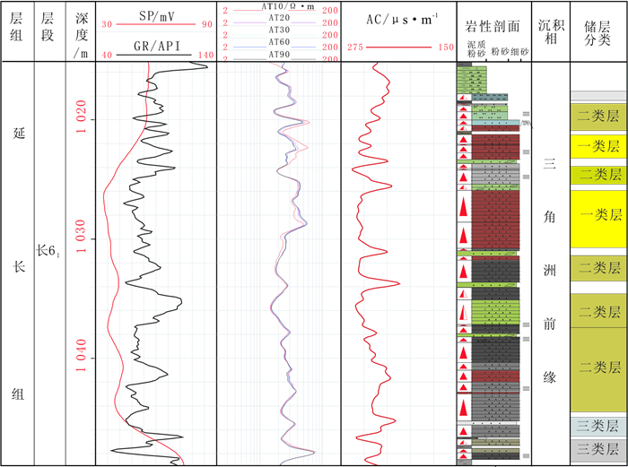 1 地质与开发概况AS,JA油田构造位置位于鄂尔多斯盆地伊陕斜坡上, 总体为西倾的大单斜, 地层平缓, 倾角仅0.5°左右。生产层位是中生界上三叠系延长组长6段(见图 1), 为一套内陆拗陷型浅水湖盆三角洲沉积体系, 物源方向为东北向。主力开发层段是一套近30~50 m厚的细粒沉积物, 主要为水下分流河道、河道侧翼、薄层溢岸砂等沉积砂体类型, 平均孔隙度为13.7%, 平均空气渗透率为2.29×10-3 μm2, 属于低孔、特低渗透储层。AS,JA油田开发初期,多采用300~330 m不规则正方形反九点或菱形反九点井网,一套开发层系,并优先射开物性相对好的层段合采生产。目前, 油田已进入中高含水阶段, 含水率快速上升, 采油速度大幅下降, 油田稳产面临挑战。