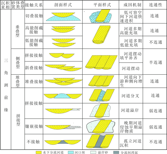 2) 复合砂体内部构型相研究是储层非均质性表征的一个重要方面。基于地质露头和密井网资料的精细解剖, 建立了浅水湖盆三角洲前缘复合砂体垂叠、侧叠、堆叠和拼接等10种构型相类型, 为平面均衡注水和精细分层注水等提供地质依据。