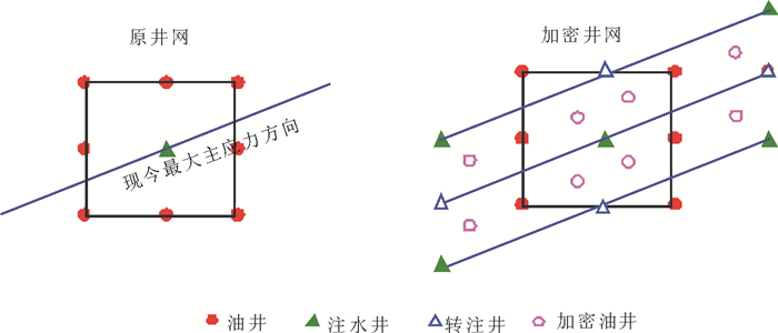 特低渗透油藏中,高含水阶段最强的非均质特征表现为动态裂缝的形成加剧了裂缝系统与基质的渗透率差异。随着开发程度的不断深入, 位于现今最大水平主应力方向的油井出现暴性水淹, 直至高含水关井。动态裂缝的快速形成, 降低了平面波及范围和剖面动用程度。延缓动态裂缝的延伸速度有利于提高波及面积, 较慢的裂缝延伸速度甚至能形成比无动态裂缝储层水驱更大的波及面积。而动态裂缝的延伸速度对水驱采收率的影响与开发技术相关。制定合理的注水技术, 由强采、强注向温和注水转变, 有效控制和利用动态裂缝, 扩大波及体积, 可提高油藏水驱采收率。特低渗透油田裂缝方向与井网匹配关系是加密调整井网优化的关键。试验区井网型式由井排方向与现今最大水平主应力方向成22.5°夹角的不规则正方形反九点井网加密, 调整为沿动态裂缝线状注水(见图 11), 预计采收率可提高5%以上。