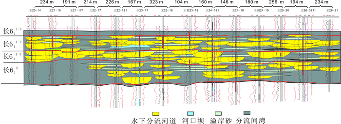 在砂体规模定量刻画和密井网资料精细解剖的基础上, 总结出长6段三角洲前缘复合砂体10种内部构型相类型(见图 10)。受物源供给及可容空间变化的影响, 内部构型相有垂叠、侧叠、堆叠和拼接等类型。主力层以堆叠和侧叠接触为主, 非主力层主要以河道砂体与溢岸砂体拼接、孤立状河道砂体为主。复合砂体内部不同构型相类型造成砂体连通性差异, 这为平面均衡注水、纵向上精细分层注水提供了地质依据。比如多期河道侧向拼接成连片砂体内要控制注水, 河道砂体与溢岸砂体拼接模式则要加强注水。