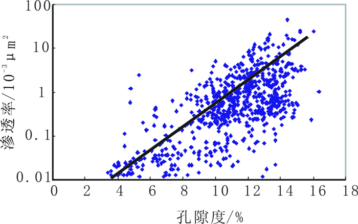 图 3 孔隙度与渗透率关系 Fig. 3 Relation between porosity and permeability |