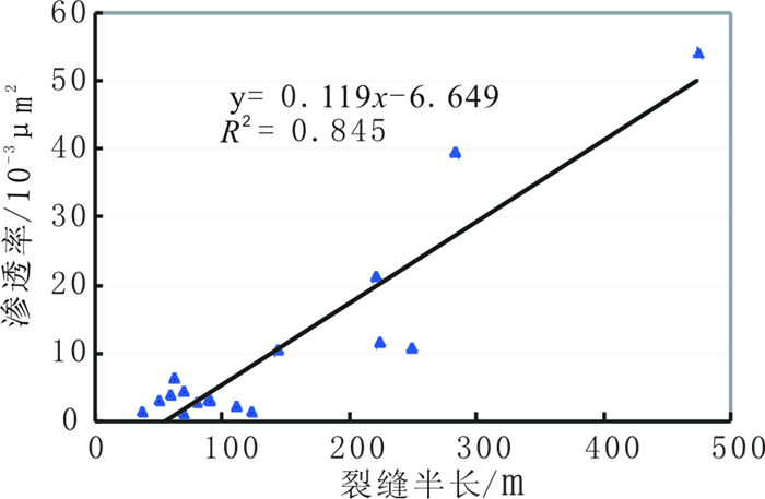 图 4 裂缝半长与渗透率关系 Fig. 4 Relation between half of fracture length and permeability |