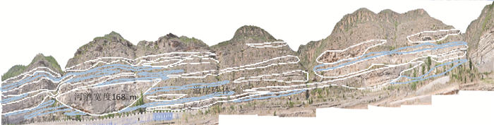 3.1 河道砂体规模的定量表征鄂尔多斯盆地延长组的地质露头资源丰富,出露良好。图 8为延安地区谭家河村延长组长6段地质露头砂体的展布剖面。从剖面上可以识别出,研究区发育的砂体类型有水下分流河道砂、溢岸砂体及少量河口坝砂体[18-20]。通过观察测量, 水下分流河道砂体宽度普遍小于200~300 m, 厚度小于8 m, 宽厚比小于30:1。个别展布范围较大的砂体是河道的摆动方向与剖面出露方位斜交造成的。