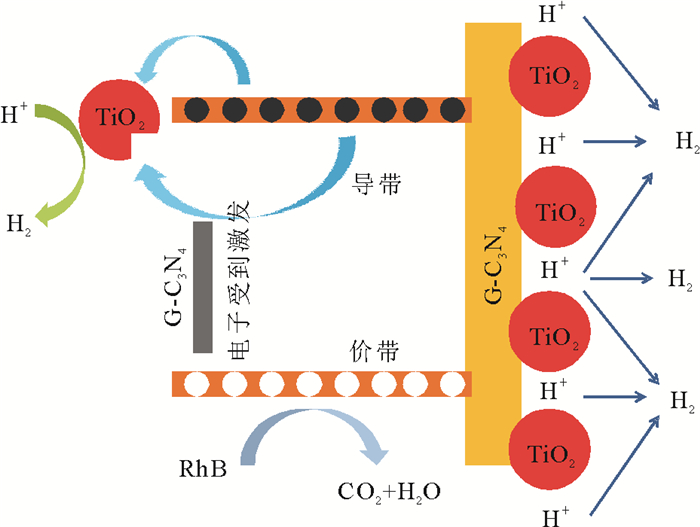 在光催化过程中, 影响其光催化活性的主要因素有3个方面, 光生电子的产生效率, 载流子的传递效率, 光生电子和空穴复合。光催化总效率为三者的乘积, 即η总=η1×η2×η3。因此, 改善以上3个方面中的任意一个都可以提高光催化效果。对于该复合样品来说, 主要是通过抑制光生电子和空穴的复合, 同时提高载流子的传递速率和光吸收范围来提高光催化活性。其主要机理如图 10所示, g-C3N4的基态电子接受光能量后变成激发态并聚集形成导带(方程1中的e), 而留下的空穴聚集形成价带(方程1中的h+)。价带则具有一定的氧化性(方程2,3)而导带具有一定的还原性(方程4,5)而, 降解罗丹明B则是h+起主要作用, 制氢过程则是光生电子和质子氢的作用。该机理可以解释为光生电子很快的从g-C3N4体相迁移到表面后转移至TiO2上而空穴的则留在g-C3N4表面, 而光生电子转移到TiO2上以后因为电势差(g-C3N4的导带电势(-1.13 eV)比TiO2的导带电势(-0.3 eV)更负)的作用很难再回到g-C3N4表面。所以,该复合物可以有效地提高载流子的传递速率, 同时可以抑制光生电子和空穴的复合、拓宽光吸收范围, 从而提高光催化活性。