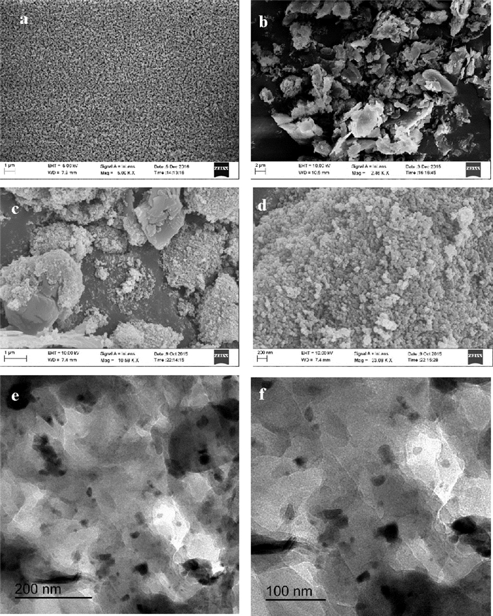 图 2分别为所得纯TiO2, g-C3N4以及复合样品3-TiO2/g-C3N4的SEM图和TEM图。其中,图a为纯TiO2的SEM图,可以看出, 所购TiO2的尺寸约为80 nm左右。图b为Sg-C3N4的SEM图, 可以看出该样品为二维片状材料。图 2(c)和图 2(d)为复合物样品3-TiO2/g-C3N4的SEM图。可以看出, 粒状的粉末状物质为TiO2颗粒, 底部的块状物质则为Sg-C3N4, 并且TiO2均匀地负载在g-C3N4的表面。将图 2(c)局部放大后,可以看出TiO2均匀地包覆在Sg-C3N4表面(图 2(d))。图 2(e)和图f为复合样品3-TiO2/g-C3N4的TEM图, 其中图f为图e的放大图。可以看到,黑色斑点为TiO2纳米颗粒, 底部的灰色片状物质则为少层g-C3N4纳米片。