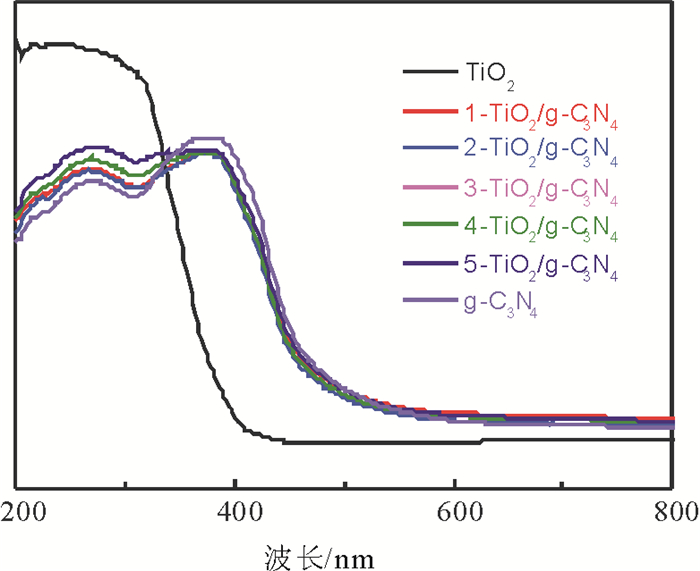 TiO2/g-C3N4复合物的制备称取适量TiO2粉末加入到100 mL制备好的Sg-C3N4悬浮液,并搅拌均匀, 在80℃下搅拌蒸干。将蒸干后的样品在400℃下煅烧2h, 自然冷却即为TiO2/g-C3N4复合物。其中,TiO2质量分数为1%~5%的样品,分别记为1-TiO2/g-C3N4, 2-TiO2/g-C3N4, 3-TiO2/g-C3N4, 4-TiO2/g-C3N4和5-TiO2/g-C3N4。