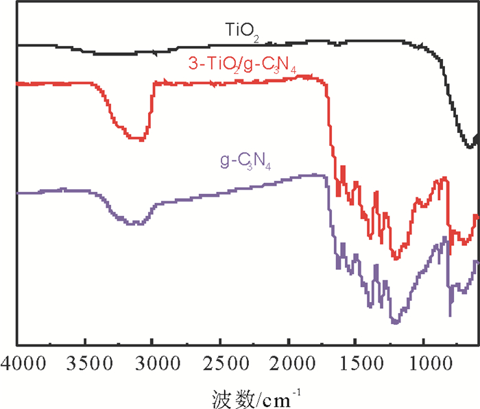 图 4 纯g-C3N4, TiO2和3-TiO2/g-C3N4样品的FT-IR图 Fig. 4 FT-IR spectra of g-C3N4, TiO2 and 3-TiO2/g-C3N4 composites |