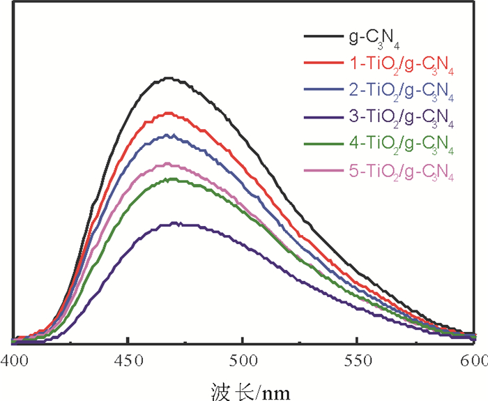 图 5为纯g-C3N4以及复合物1-TiO2/g-C3N4, 2-TiO2/g-C3N4, 3-TiO2/g-C3N4, 4-TiO2/g-C3N4, 5TiO2/g-C3N4的光致发光光谱图。可以看出,光致发光的强度与样品的光生电子空穴的复合率密切相关。峰越强表示该样品的光生电子空穴的复合率越高。因此,所有的复合物都可以有效地抑制光生电子空穴的复合。在复合物中, 随着TiO2的含量不断增加, 其荧光强度先减弱、后增加。其中,在TiO2质量分数为3%时荧光强度最弱, 即3-TiO2/g-C3N4可以有效抑制光生电子和空穴的复合, 从而改善光催化性能。