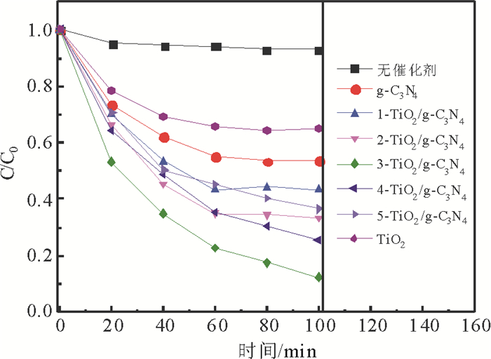 2) 当TiO2的质量分数为3%时光催化活性最强, 过量的TiO2反而阻止了被降解物分子和g-C3N4的接触,从而抑制其光催化活性。不足量的TiO2则不能将g-C3N4产生的光生电子完全转移, 达不到最好光催化效果。