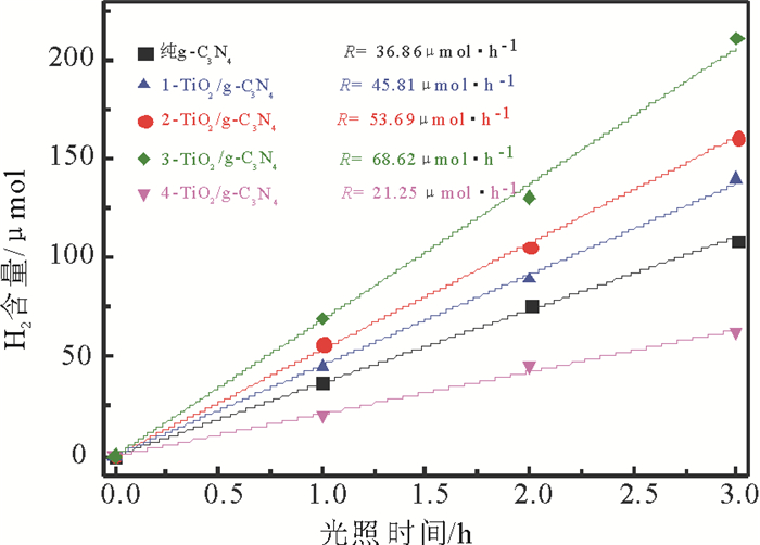 复合样品的光催化降解罗丹明B实验说明在3-TiO2/g-C3N4复合样中留下的空穴比较多, 可以很快将有机染料氧化成二氧化碳和水。同时, 光生电子的利用率采用光催化分解水制氢试验来测试。从图 7中可以看出, 纯g-C3N4的产氢速率为36.86 μmol/h, 当TiO2的质量分数为1%,2%,3%和4%的产氢速率分别为45.81 μmol/h,53.69 μmol/h,68.62 μmol/h和21.25 μmol/h。其中, TiO2质量分数在3%时产氢速率最高, 当质量分数不足3%产氢速率随着TiO2的质量分数增加而升高, 当超过3%时, 产氢速率反而下降。其主要原因为TiO2的质量分数不足3%时, 其产氢速率主要受光生电子的分离速率影响, 由于TiO2的含量较少, 不能充分地将g-C3N4的光生电子全部转移到TiO2上, 因此制氢速率会随着TiO2的含量增加而升高。当TiO2质量分数超过3%时, 产氢速率主要由TiO2表面的光生电子势能影响。由于TiO2的导带电势只有-0.3 eV, 远低于g-C3N4的-1.13 eV, 因此当TiO2的质量分数超过3%时, 其产氢速率反而下降的特别明显, 甚至不如纯g-C3N4的产氢速率。