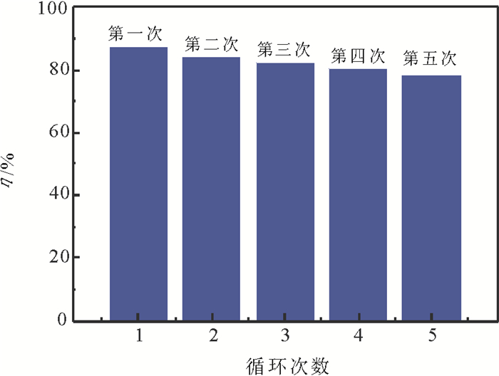 为了测试所制备3-TiO2/g-C3N4的稳定性, 将该样品循环用于罗丹明B的降解实验, 其降解条件与之前条件完全相同, 所得结果如图 8所示。可以看出, 该样品在经过5次循环降解试验后, 其降解性能并没有出现明显的减弱, 表明该样品的稳定性比较好。在5次循环实验中, 其降解率分别为87.7%, 84.3%, 82.5%, 80.2%以及78.3%。因此, 该复合样品稳定性比较好, 有很好的应用潜力。