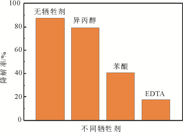 在罗丹明B的降解实验中分别加入异丙醇, 苯醌以及EDTA-2Na作为·OH, ·O2-以及h+的捕获剂, 其结果如图 9所示。在没有加入任何捕获剂时, 其降解率为87.7%, 当加入异丙醇时, 其降解率有所降低, 但不太明显。当加入苯醌时, 其降解率明显降低, 说明·O2-在罗丹明B的降解中也是主要的活性物种。然而, 当加入EDTA-2Na时, 其降解率明显被抑制, 说明h+在降解过程中是最主要的活性物种。因此, 在罗丹明B的降解过程中, 最主要的活性物种为h+, ·O2-次之, ·OH对降解的抑制作用最弱。从该实验结果可以推测3-TiO2/g-C3N4的复合样可以有效的将电子和空穴分离, 从而提高光催化效果。