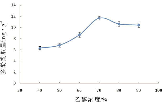 图 1 乙醇浓度对北苍术多酚提取量的影响 Fig. 1 Effect of ethanol concentration on the yield of polyphenols |