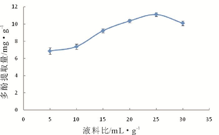 不同液料比对北苍术多酚提取量的影响结果见图 2。北苍术多酚的提取量随着液料比的增加而增大, 当液料比为25mL/g时, 北苍术多酚提取量达到最大, 随着液料比的继续增加, 北苍术多酚提取量下降。可见, 25mL/g的液料比可以使北苍术多酚有较好的提取量。低浓度的液料比使北苍术多酚提取不充分, 高浓度的液料比会导致一些其他物质如多糖溶出, 从而抑制多酚提取量[22], 因此, 合适的液料比对多酚类物质的有效提取至关重要。经查阅文献发现, 米糠[20]和石榴渣[15]多酚提取时的液料比为20mL/g, 猕猴桃果皮[16]和西藏野生卷叶黄精[17]多酚提取时的液料比为25mL/g, 窄叶鲜卑花[19]和黔产接骨草[18]多酚提取时的液料比分别为60mL/g和75mL/g, 由此可知, 不同植物多酚类物质提取所用的液料比均不同, 实验时应根据具体的实验材料选择合适的液料比。