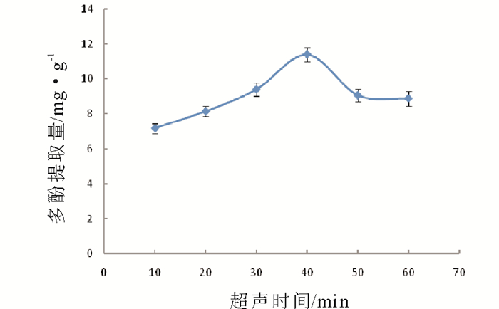 不同超声时间对北苍术多酚提取量的影响结果见图 3。北苍术多酚的提取量随着超声时间的增加而增大, 在超声时间为40 min时, 北苍术多酚的提取量达到最大, 之后超声时间增加, 北苍术多酚提取量下降。可见, 40 min的超声时间可以使北苍术多酚有较好的提取量。研究证明, 合适的超声时间可以让多酚提取的过程反应完全, 过长的超声时间会因为机械力和热能破坏多酚结构, 导致多酚提取量降低[23]。以往实验报道, 超声辅助提取猕猴桃果皮[16]和黔产接骨草[18]多酚时的超声时间分别为25 min和50 min, 本实验发现, 40 min的超声时间可以使北苍术多酚有较好的提取量, 而采用传统提取法提取米糠[20]、西藏野生卷叶黄精[17]和石榴渣[15]多酚时, 其提取时间分别为2 h,2.5 h和3.5 h。可见, 超声提取法提取时间明显缩短。