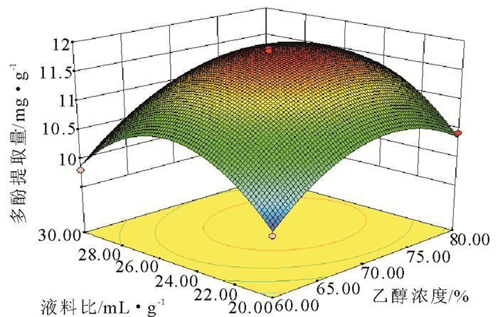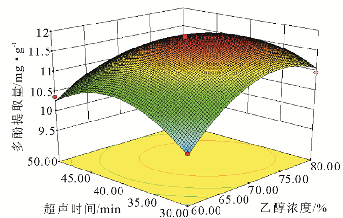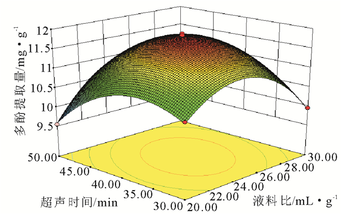 2.3.2 响应面优化影响北苍术多酚提取量各因素间的交互作用的响应曲面如图 4~6所示,可以得到乙醇浓度、液料比、超声时间之间交互关系的直观表现。响应曲面图的抛物面越明显, 因素之间的交互作用越强; 响应曲面图的抛物面越不明显, 因素之间的交互作用越弱[24]。结合P值分析可知, 因素间交互作用的影响为:液料比-超声时间的交互影响>乙醇浓度-超声时间的交互作用, 而乙醇浓度-液料比间的交互作用影响不显著。