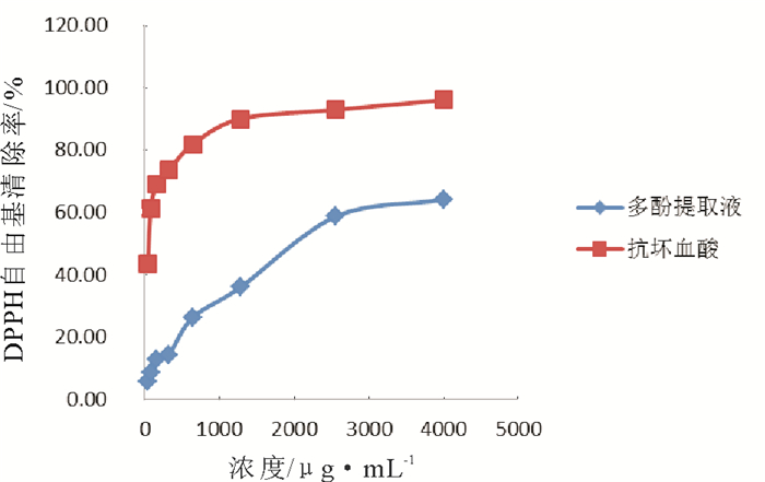 2.4 DPPH自由基清除能力测定结果北苍术多酚提取液对DPPH自由基清除率的结果见图 7。由图 7可知, 北苍术多酚提取液和抗坏血酸对DPPH自由基均有一定的清除作用, 且随着其质量浓度的增加, 清除率也增加, 清除率最高分别可达到63.98%和96.02%。北苍术多酚提取液对DPPH自由基的清除能力可以用DPPH自由基清除率为50%时所对应的样品浓度(IC50)来衡量。经分析计算得出, 北苍术多酚提取液和抗坏血酸的IC50值分别为2.10 mg/mL和0.05 mg/mL, 与抗坏血酸相比, 北苍术多酚提取液对DPPH自由基清除能力较弱。根据计算出的IC50值可知, 北苍术多酚提取液具有清除DPPH自由基的能力, 后续可通过分离纯化实验获得清除能力更强的多酚物质。