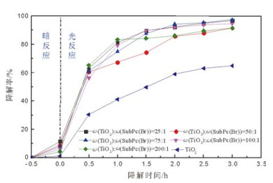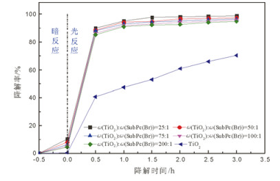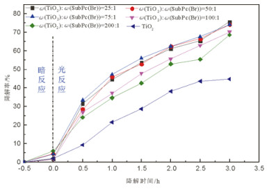 图 7 不同质量比的TiO2-SubPc(Br)催化剂对甲基橙的降解性能 Fig. 7 Methyl orange degradation by catalysts of different mass ratios TiO2-SubPc(Br) |