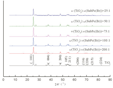 式中:λ为入射波长, K=0.89, θ为衍射角(rad), β为最高X-射线衍射峰半峰宽(rad), 可得DTiO2=20.1nm, Dω(TiO2):ω(SubPc(Br))=200:1=20.1nm, Dω(TiO2):ω(SubPc(Br))=100:1=20.7nm, Dω(TiO2):ω(SubPc(Br))=75:1=23.9nm, Dω(TiO2):ω(SubPc(Br))=50:1=25.9nm, Dω(TiO2):ω(SubPc(Br))=25:1=28.5nm, 随着SubPc(Br)加入量的增多纳米复合材料的粒径增大。