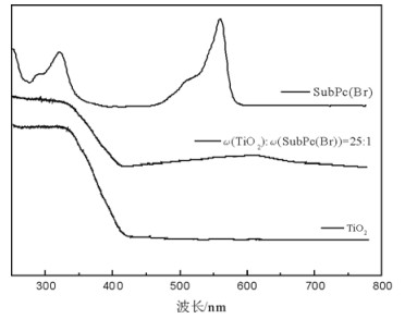 图 4 TiO2,ω(TiO2):ω(SubPc(Br))=25:1及SubPc(Br)的紫外-可见光谱图 Fig. 4 UV-Vis absorption spectrum of TiO2, ω(TiO2):ω(SubPc(Br))=25:1 and SubPc(Br) |