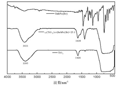 图 5 TiO2,ω(TiO2):ω(SubPc(Br))=25:1及SubPc(Br)的红外光谱图 Fig. 5 IR spectrum of TiO2, ω(TiO2):ω(SubPc(Br))=25:1 and SubPc(Br) |
