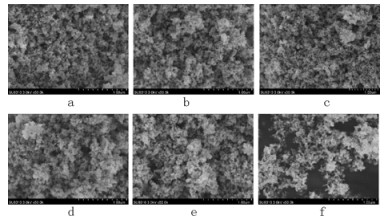 a ω(TiO2):ω(SubPc(Br))=25:1;b ω(TiO2):ω(SubPc(Br))=50:1;c ω(TiO2):ω(SubPc(Br))=75:1;d ω(TiO2):ω(SubPc(Br))=100:1;e ω(TiO2):ω(SubPc(Br))=200:1;f TiO2 图 6 不同质量比的TiO2-SubPc(Br)催化剂的扫描电子显微镜照片 Fig. 6 SEM images of different mass rations TiO2-SubPc(Br) |