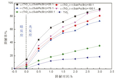 不同质量掺杂比的TiO2-SubPc(Br)催化剂对溴酚蓝的降解作用如图 10所示。由测试结果可知, SubPc(Br)敏化后的TiO2催化剂对溴酚蓝的降解在反应开始的1h时已达90%以上, 而未敏化的TiO2降解率仅为40.9%。质量比为25:1,50:1,75:1,100:1及200:1的TiO2-SubPc(Br)催化剂在3h时对溴酚蓝的降解率分别为99.2%,97.7%,96.7%,95.98%和95.05%, ω(TiO2):ω(SubPc(Br))=25:1效果最优。