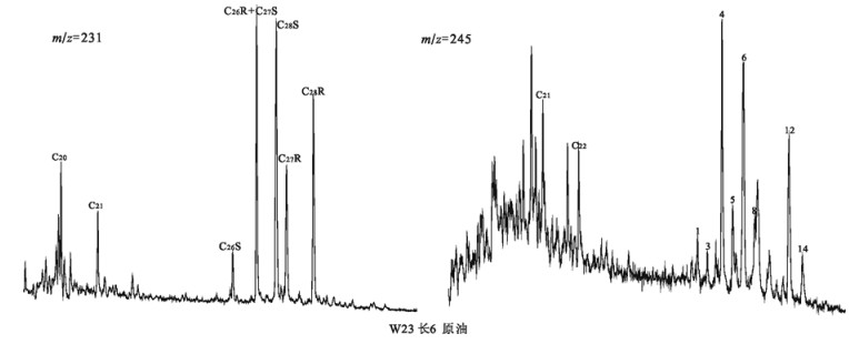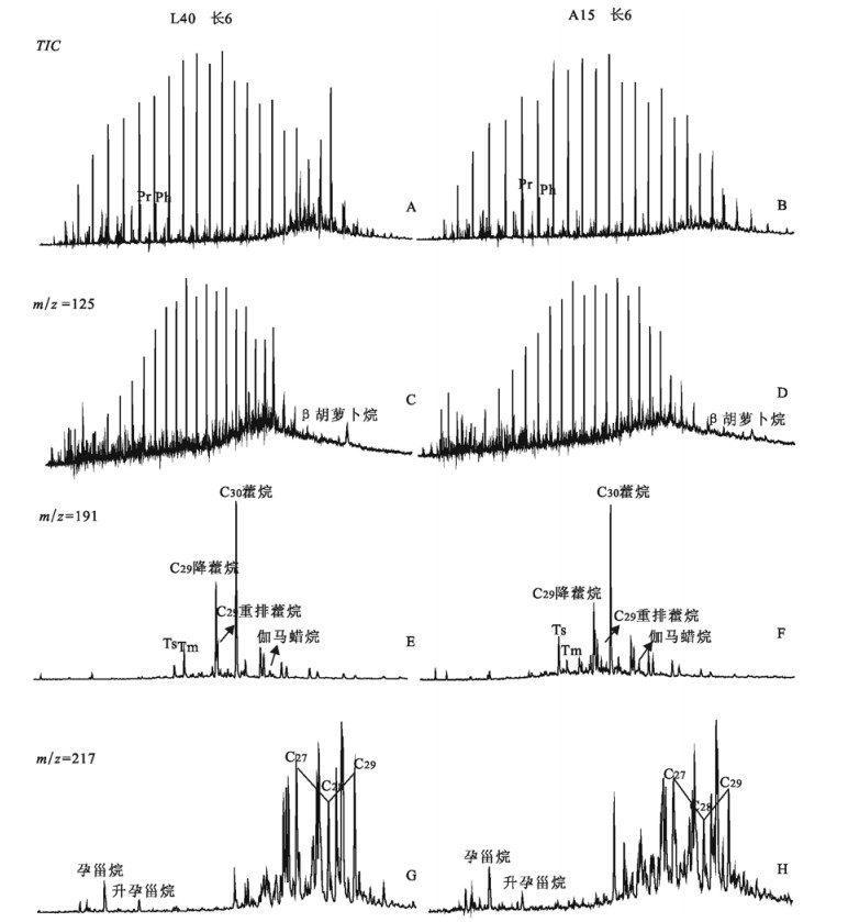 图 2 鄂尔多斯盆地延长组原油部分生物标志物质量色谱图 Fig. 2 Mass chromatogram of Crude oils in Yangchang Formation Chang 6 in the Shanbei Area, Ordos Basin |