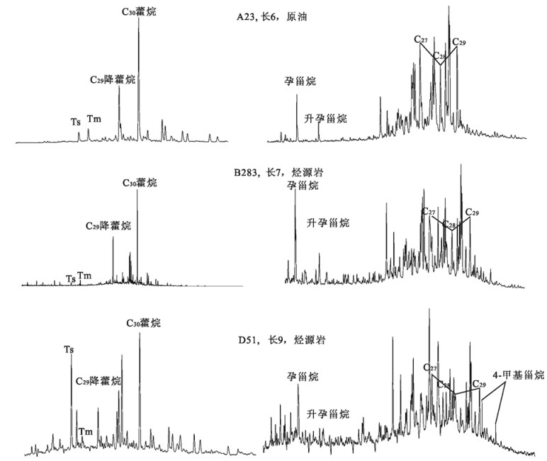 图 4 长6原油与长7烃源岩、长9烃源岩甾萜类化合物质量图 Fig. 4 Mass chromatogram of Crude oils in Yangchang Formation Chang 6 and the Chang 7 and Chang 9 source rocks in the Shanbei Area, Ordos Basin |
