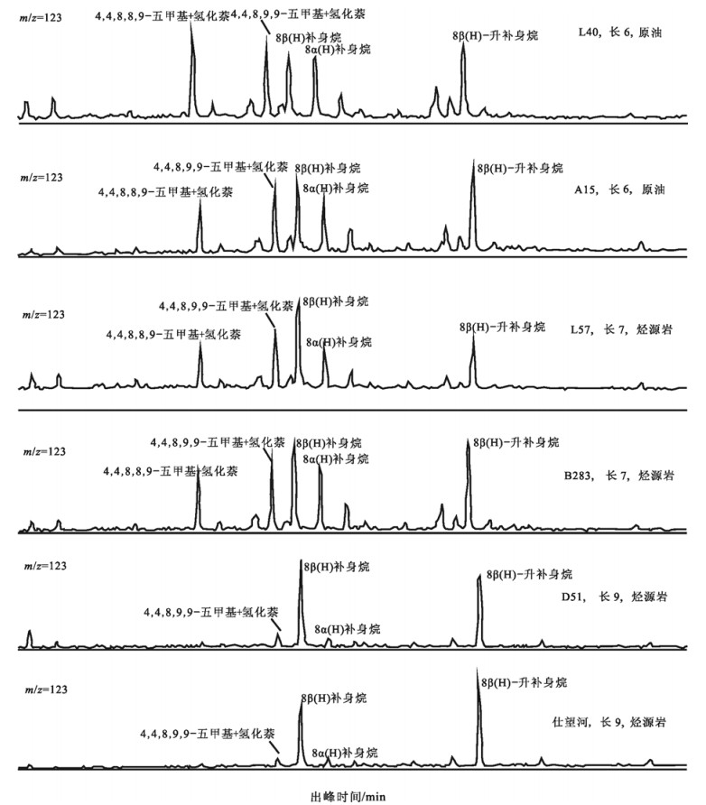 从陕北地区长6原油与长7烃源岩、仕望河长9烃源岩、D51井长9烃源岩的谱图对比可以看出(见图 5), 长7烃源岩中8β(H)补身烷和4, 4, 8, 8, 9-五甲基十氢化萘含量较高, 这与陕北地区长6原油的地球化学特征一致, 而与仕望河剖面长9和D51长9烃源岩存在差异。