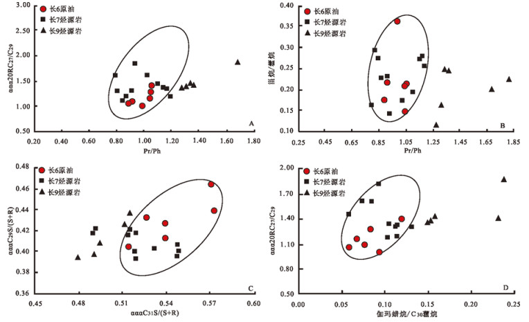 1)ααα20RC27甾烷/C29甾烷反映母质类型, 长6原油ααα20RC27甾烷/C29甾烷介于1.01~1.41, 平均值为1.17;长7烃源岩介于1.12~1.85, 平均值为1.39;长9烃源岩介于1.37~1.88, 平均为1.49。Pr/Ph反映沉积环境, 长6原油介于0.88~1.05, 平均值为0.98;长7烃源岩介于0.79~1.19, 平均值为0.98;长9烃源岩介于1.27~1.68, 平均为1.39。从二者的相关图可以看出, 长6原油与长7泥岩样品在上述参数相关性上较好(见图 5A), 表明长6原油和长7烃源岩与侏罗系原油具有亲缘关系;长9泥岩抽提物与长6原油二者相关性较差(见图 6A)。