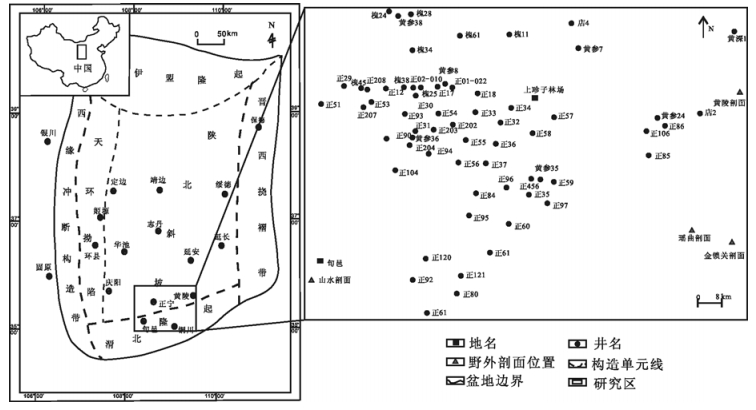 图 1 鄂尔多斯盆地构造单元及研究区位置 Fig. 1 Tectonic unit of Ordos Basin and locations of study area |