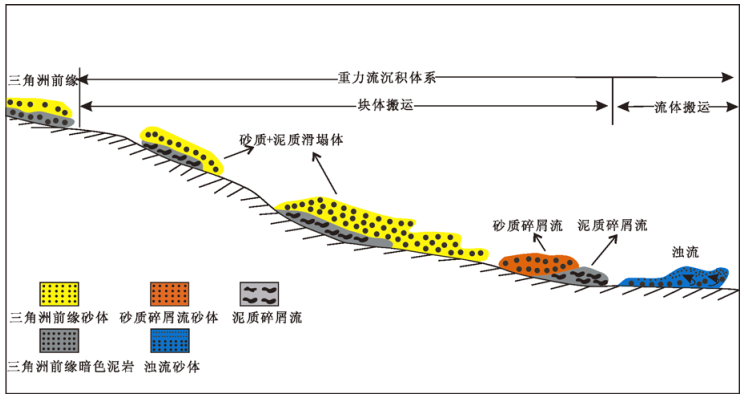 鄂尔多斯盆地南部三角洲前缘水下分流河道砂体和暗色泥岩在重力作用或火山作用、地震等外力作用下,沿着剪切面发生轻微变形形成滑动砂体, 滑动砂体继续沿着剪切面向深湖方向滑塌, 在滑移面上堆积下来形成滑塌砂体;高密度颗粒流在整体块状流动中, 遇到液化及湖水稀释, 砂体发生块体搬运, 在斜坡带坡脚处形成砂质碎屑流;砂质碎屑流继续向深湖方向搬运, 砂体浓度降低, 在重力分异作用下形成浊积岩(见图 2)。