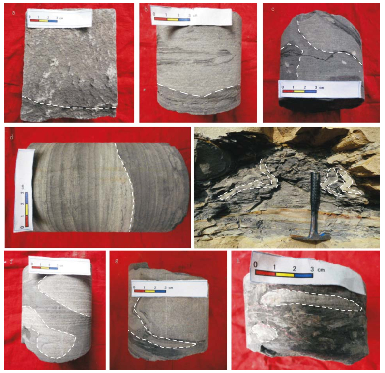 a砂岩顶部突变,底部剪切1 175.45 m,正33;b滑动构造1 465.15 m,正29;c滑塌构造1 584.65 m,正104;d底部突变1 130.9 m正97;e向下注入的砂岩脉瑶曲东野外露头;f泥岩中砂质体侵入1 250.8 m正56;g砂枕构造1 465.15 m,正29;h滑动变形层理1 271.38 m,正02-010 图 4 研究区不同类型重力流沉积特征 Fig. 4 Different types of gravity flow sedimentary characteristics in the study area |