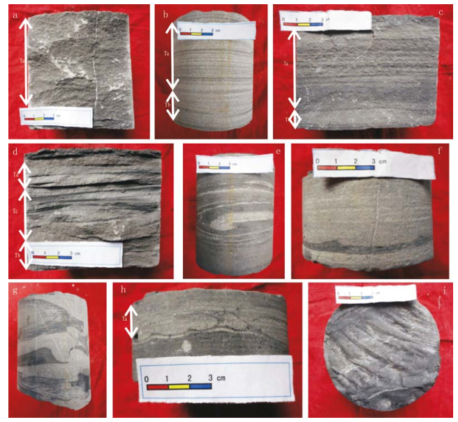 a块状粒序层理砂岩,1 498.2 m,正31;b水平层理,Ta-Tb,1 256.1 m,正02-010; c水平层理,Ta-Tb,1 237.31 m,正96;d水平层理、砂纹交错层理,1 272.5 m,正56;e砂枕,1 217.37 m,正36; f火焰状构造,1 470.83 m,正29; g泥质撕裂屑,1 271.3 m,正02-010; h沙枕构造、变形火焰状构造,1 282.05 m,正56;i槽模,1 258.44 m,正96 图 5 研究区重力流沉积构造特征 Fig. 5 Sedimentary structure characteristicsof gravity flow in the study area |