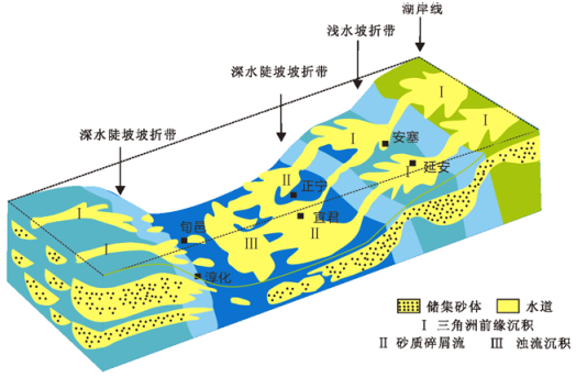 鄂尔多斯盆地南部物源供给充足, 沉积砂体沿斜坡带向下滑动。重力流沉积体系发育在三角洲前缘斜坡带之上、斜坡带及斜坡带坡脚处低凹处。鄂尔多斯盆地延长期是三角洲的高建设时期, 大量的陆源碎屑物质在三角洲前缘区沿斜坡不断向深湖—半深湖区快速沉积。特别是三角洲前缘水下分流河道及河口坝的松散沉积物受火山、地震等触发机制的影响, 在重力作用下沿斜坡形成滑塌砂体;部分滑塌沉积物在较陡的斜坡带上以层流态继续向深湖方向移动,形成块状碎屑流沉积砂体;随着流体搬运方式的变化, 大量的块状碎屑流沉积继续搬运, 在深湖区形成浊积岩。