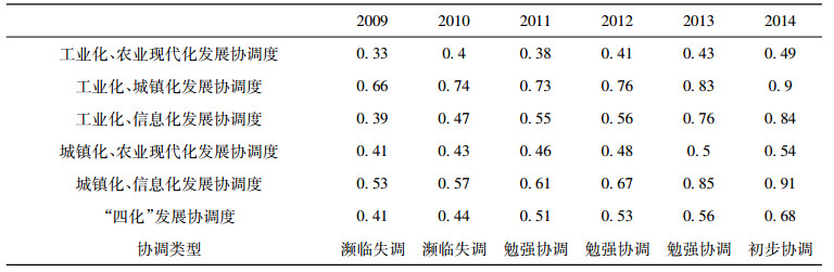 由表 2所示的协调度等级划分和表 3统计测算的陕西“四化”整体协调发展度水平可以看出, 陕西省“四化”同步发展协调度在不断优化。从2009年陕西“四化”同步发展濒临失调的状态, 逐渐改善到2011年“四化”同步发展状态勉强协调, 2014年“四化”同步发展达到初步协调状态。六年间, 陕西“四化”之间两两协调的程度也不断优化提高。根据目前陕西“四化”协调发展水平综合评价结果可预测, 未来“四化”同步协调发展状态将会越来越好, 成为社会经济发展的重要驱动力。