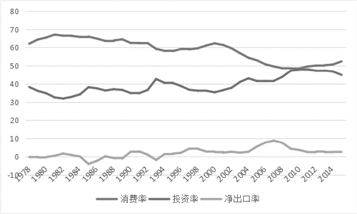 资料来源:《中国统计年鉴(2016)》及国家统计局公布数据 图 1 1978—2015年支出法GDP构成图 |