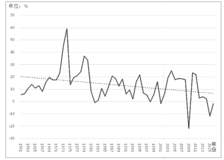 数据来源:世界银行数据库, 经笔者计算得出。 图 1 1961—2016年世界贸易额增长率 |