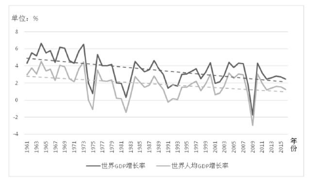 数据来源:世界银行数据库, 经笔者计算得出。 图 2 1961—2016年世界经济增长率 |
