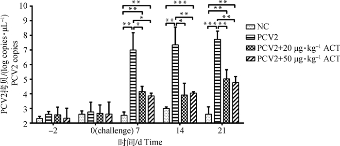 *. P<0.05,**.P<0.01,***. P<0.001。下同 *. P < 0.05, **.P < 0.01, ***. P < 0.001. The same as below 图 1 ACT对PCV2感染仔猪外周血中病毒载量的影响 Figure 1 Effect of ACT on the proliferation of PCV2 in piglet peripheral blood |