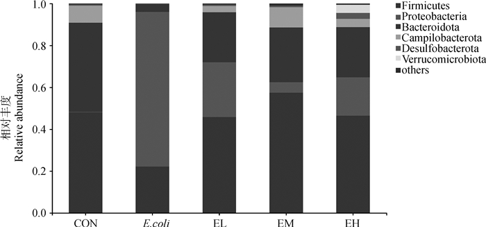 CON. 对照组;E. coli.大肠杆菌感染组;EL. 低剂量丹参大肠杆菌感染组;EM. 中剂量丹参大肠杆菌感染组;EH. 高剂量丹参大肠杆菌感染组。下同 CON. Blank control group; E. coli. E. coli infection group; EL. Low dose Radix Salvia miltiorrhiza infected with E. coli group; EM. Medium dose Radix Salvia miltiorrhiza infected with E. coli group; EH. High dose Radix Salvia miltiorrhiza infected with E. coli group. The same as below 图 6 五组小鼠粪便的韦恩图分析 Fig. 6 Venn diagram analysis of feces from five groups of mice |