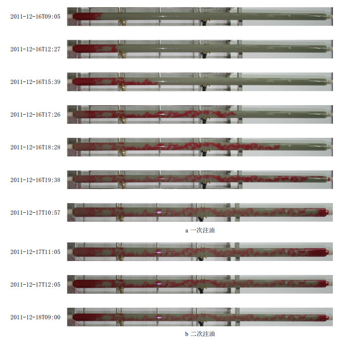 实验结果显示,煤油一次充注的过程出现了活塞式和优势式两种模式,当以一定速率注入煤油的时候,首先在模型底部形成活塞式的充注,充注率较高,随着油柱高度的不断增大,煤油逐渐沿有限的优势通道运移,而且在运移的整个过程中,运移的速率逐渐增大,运移至顶部时,逐渐形成了聚集,而且运移路径上的煤油残留量在减少导致颜色逐渐变淡;二次充注煤油沿前期运移路径运移,运移通道未改变,并在模型顶部形成了聚集,运移路径上的颜色也在逐渐变淡,最终聚集量与充注量相当(图 1)。