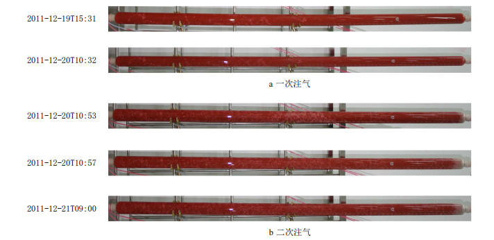 氮气一次充注的过程显示气体沿有限的通道运移,而且运移的速率较快,充注完成后,气体几乎都滞留分散在模型中下部;二次充注氮气时,气体沿更多运移路径运移,运移通道更加复杂,形成断续式运移,并且气体在通道中滞留量较大,放置一段时间后,气体在模型顶部形成聚集,但运移路径上的滞留量仍然较大(图 2)。